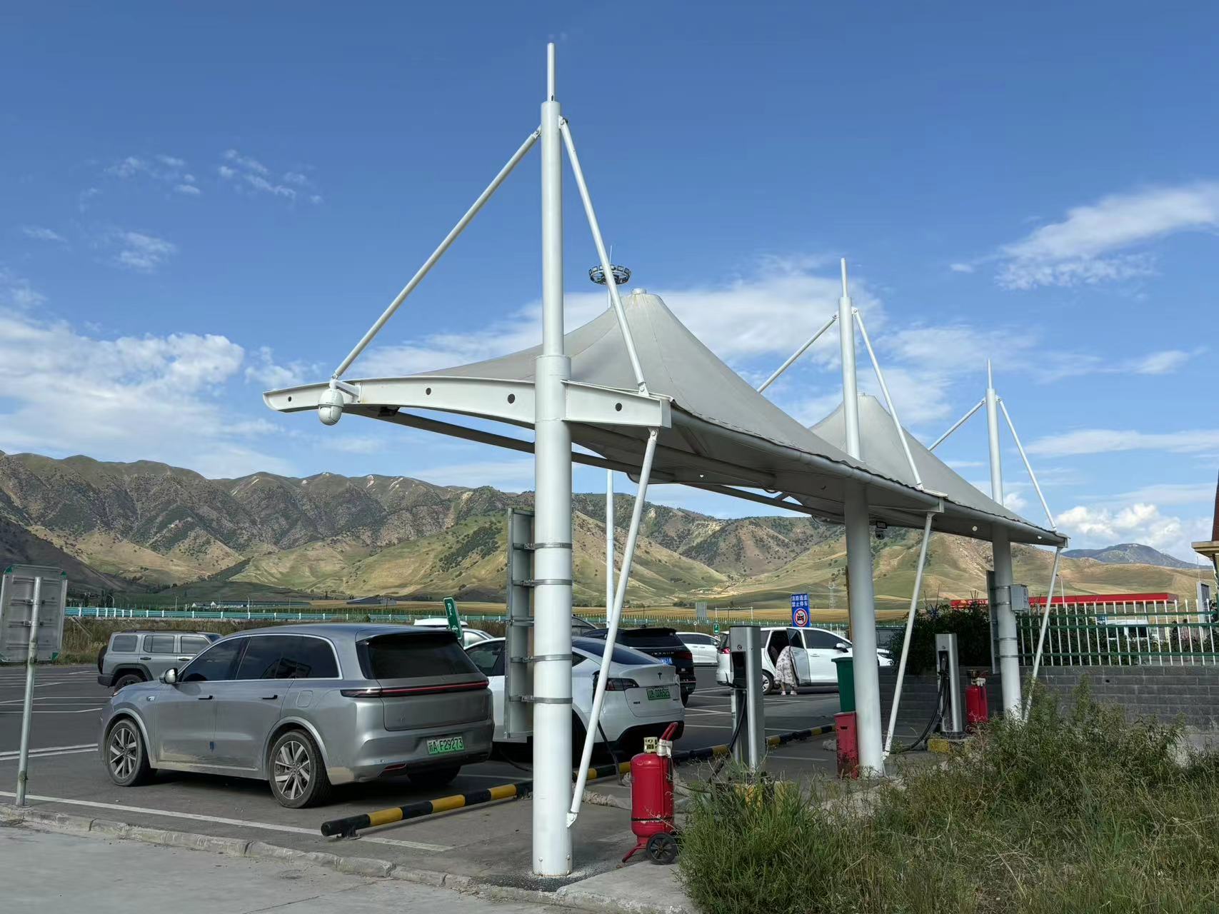 鑫淮膜结构车棚案例:加厚阻燃PVDF膜材,广泛用于小区单位、公园,园区景区等户外停车场、汽车非机动车充电桩专用停车棚